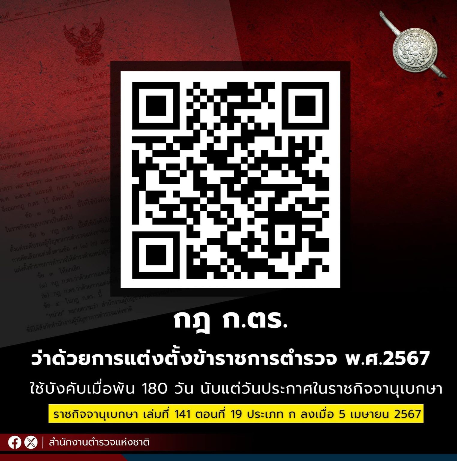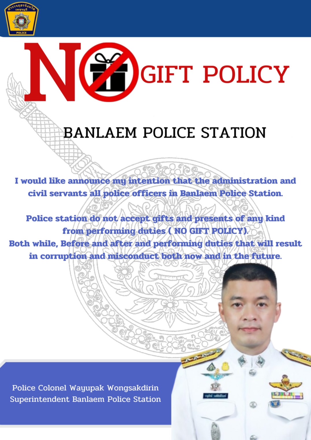 - ประกาศสำนักงานยุทธศาสตร์ตำรวจเรื่องเจตนารมณ์ที่จะไม่รับของขวัญหรือของกำนัลทุกชนิดจากการปฏิบัติหน้าที่