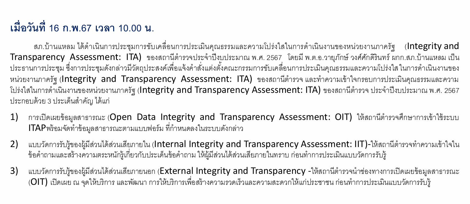 สถานีตำรวจภูธรบ้านแหลม ขับเคลื่อนการประเมินคุณธรรมและความโปร่งใสในการดำเนินงานของหน่วยงานภาครัฐ(Integrity and Transparency Assessment: ITA) ของสถานีตำรวจประจำปีงบประมาณ พ.ศ.๒๕๖๗